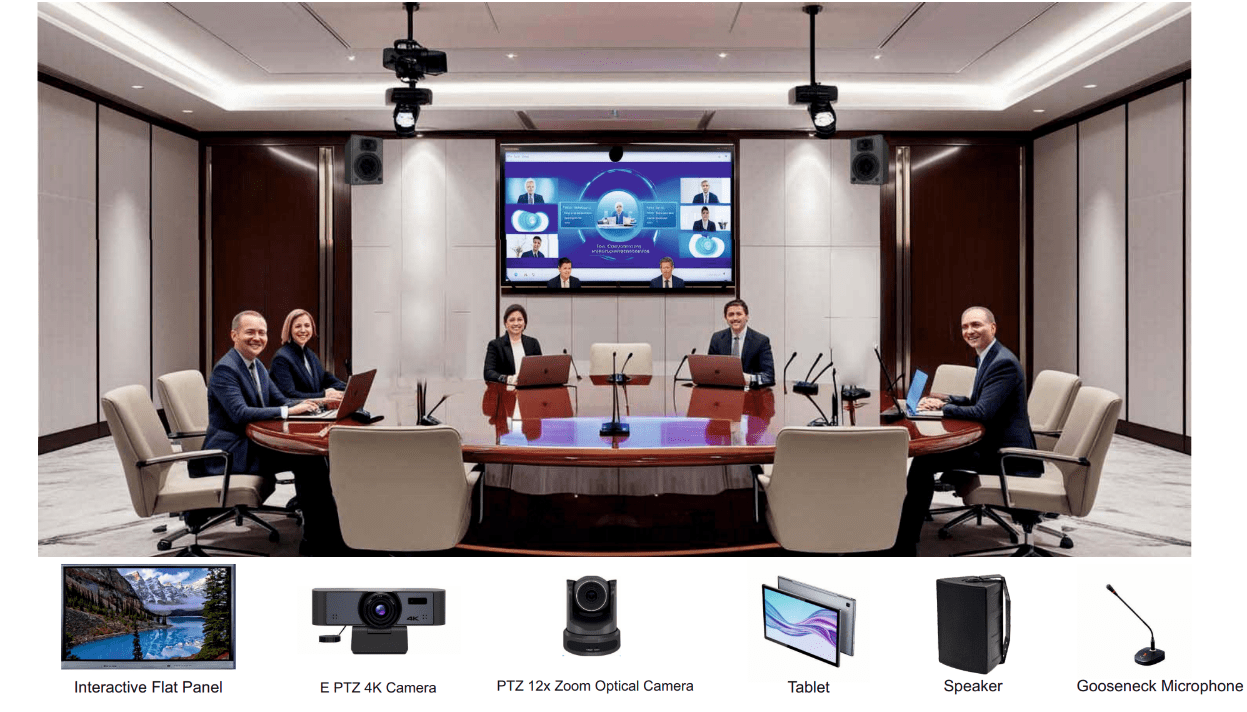 • Video Conferencing setup typically includes a high-quality camera, microphone, interactive flat panels, tablets and speakers, often paired with a reliable internet connection and a video conferencing platform. The setup ensures clear communication through video and audio, allowing remote participants to connect seamlessly for meetings, presentations, or collaboration. Key elements include a well-lit environment, proper positioning of equipment and an intuitive user interface for ease of use. Ideal for businesses,  education, government or personal communication