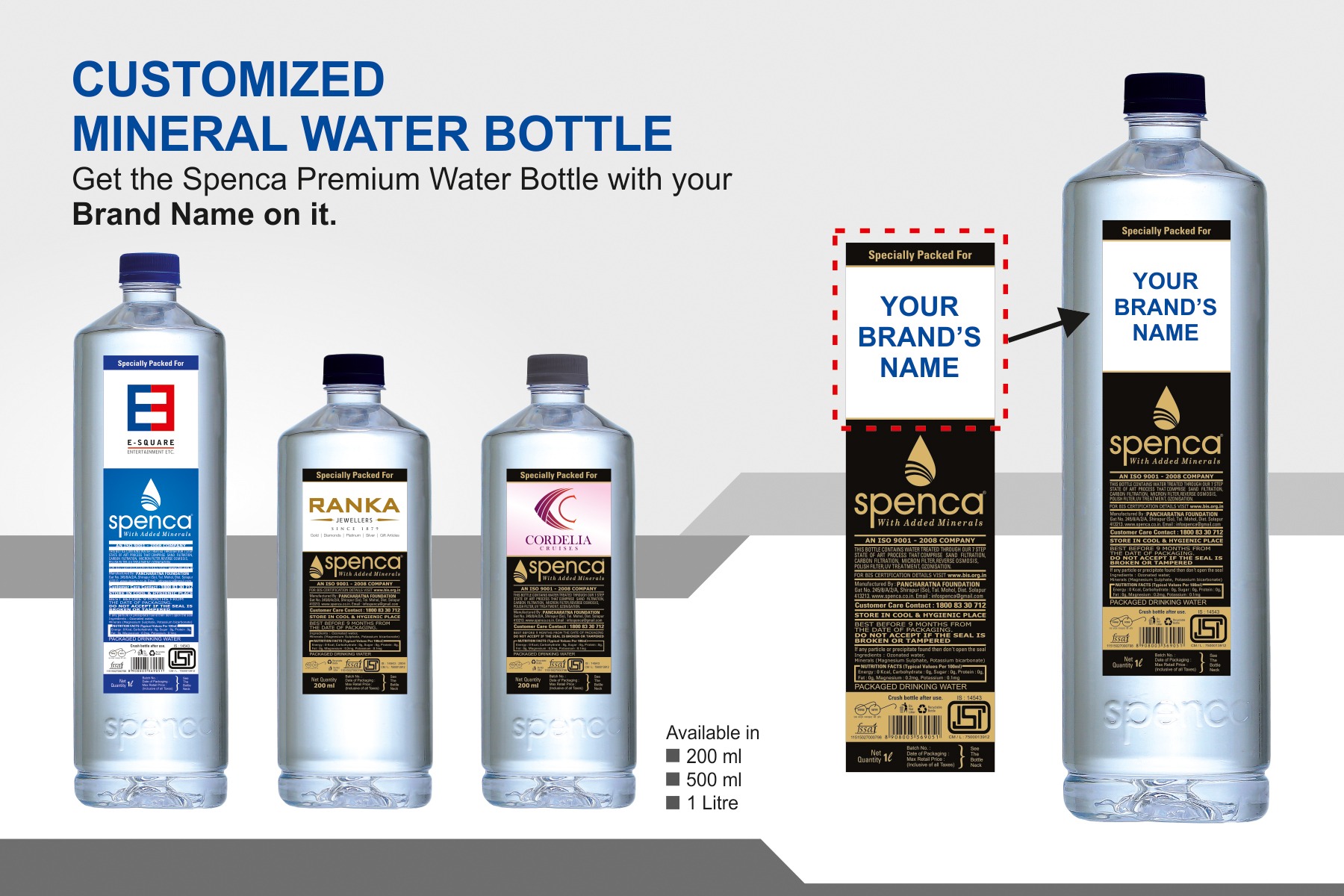 Get the name of your brand on the Spenca Premium Mineral Water Bottle and Spenca Alkaline Water Bottle exclusively for your esteemed customers.